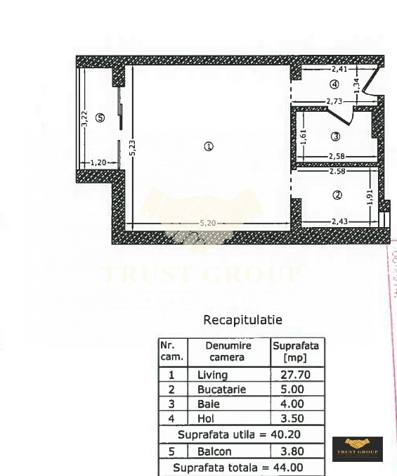Dispune de o suprafata totala de 44mp, este decomandata si compartimentata astfel: camera, baie, spatii de depozitare, bucatarie si balcon.