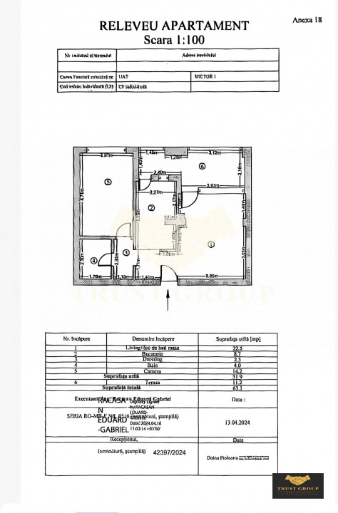 Dispune de o suprafata totala de 63mp, este decomandat si compartimentat astfel: living, bucatarie, dormitor, baie, hol, spatii de depozitare și o terasa de 11mp..