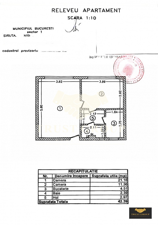 Dispune de o suprafata totala de 42mp, este semidecomandat si compartimentat astfel: living, bucatarie, dormitor, baie, hol si spatii de depozitare.