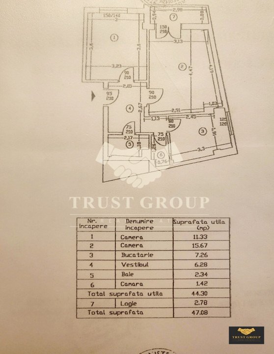 Dispune de o suprafata totala de 47mp, este semidecomandat si compartimentat astfel: living, bucatarie, dormitor, baie, hol, spatii de depozitare.