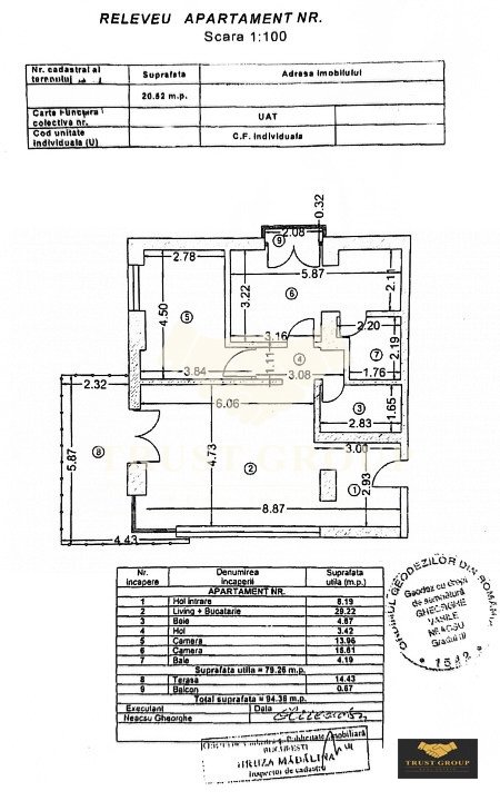 Dispune de o suprafata totala de 95mp, este decomandat si compartimentat astfel: living, bucatarie, doua dormitoare, doua bai, hol, spatii de depozitare si un balcon.