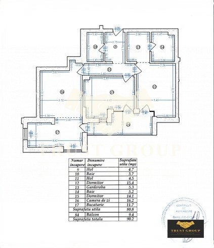 Dispune de o suprafata totala de 90mp, este decomandat si compartimentat astfel: living, bucatarie, doua dormitoare, doua bai, hol, spatii de depozitare si un balcon de 10mp.
