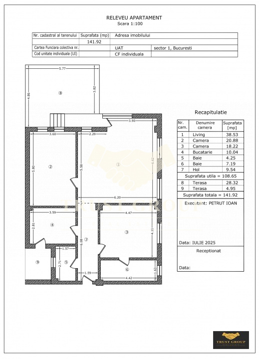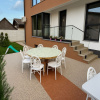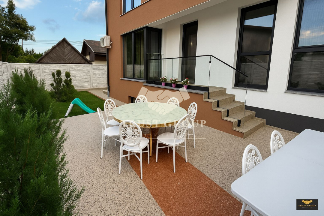 Dispune de o suprafata totala de 142mp, este semidecomandat si compartimentat astfel: living, bucatarie, doua dormitoare, doua bai, hol, spatii de depozitare si o terasa de 33mp si o curte de 100mp.