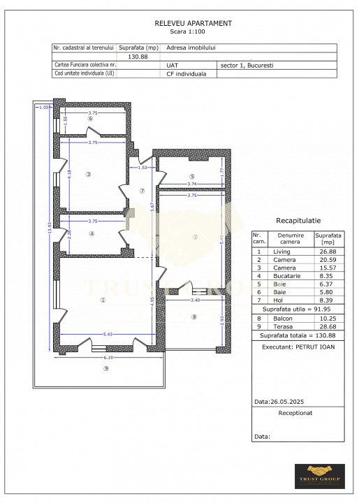 Dispune de o suprafata totala de 130mp, este semidecomandat si compartimentat astfel: living, bucatarie, doua dormitoare, doua bai, hol, spatii de depozitare, un balcon de 10mp si o terasa de 29mp.