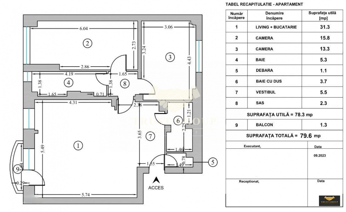 Dispune de o suprafata totala de 80mp, este decomandat si compartimentat astfel: living, bucatarie, doua dormitoare, doua bai, hol, spatii de depozitare si un balcon.