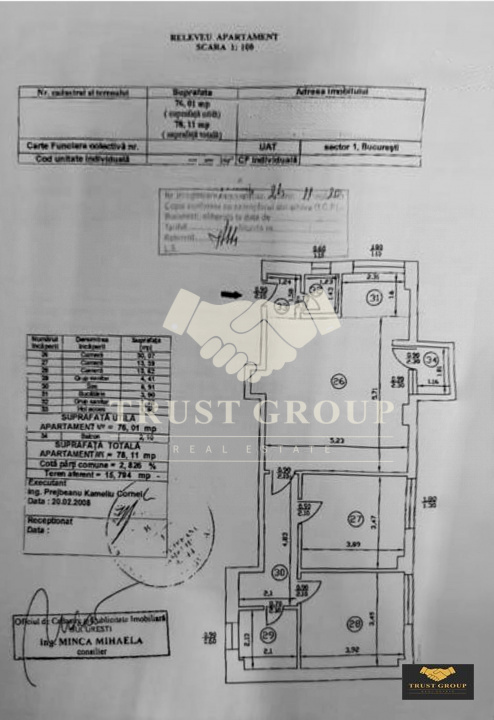 Dispune de o suprafata totala de 78mp, este semidecomandat si compartimentat astfel: living, bucatarie, doua dormitoare, doua bai, hol, spatii de depozitare si un balcon.