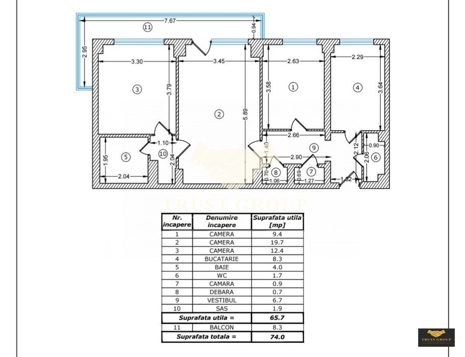Dispune de o suprafata totala de 74mp, este semidecomandat si compartimentat astfel: living, bucatarie, doua dormitoare, doua bai, hol, spatii de depozitare si un balcon.