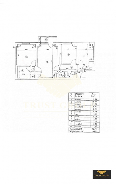 Locuința are o suprafață utilă de 63mp (66mp total) este semidecomandată și compartimentată astfel: