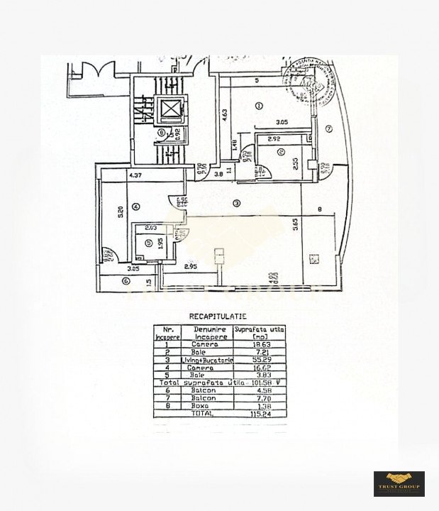 Dispune de o suprafață utilă de 115 mp, este semidecomandat și compartimentat astfel: living, bucătărie, două dormitoare, două băi, hol, spații de depozitare și balcon. Apartamentul se vinde mobilat și utilat, iar un loc de parcare poate fi achiziționat separat.