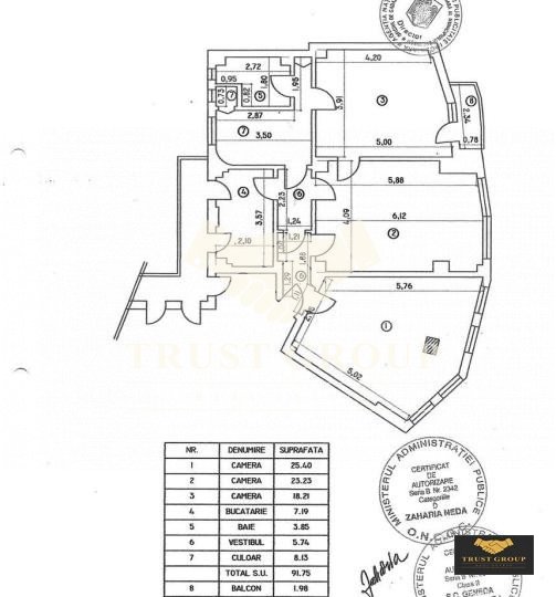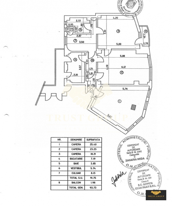 Dispune de o suprafata totala de 93mp, este decomandat si compartimentat astfel: living, bucatarie, doua dormitoare, doua bai, hol, spatii de depozitare si un balcon.