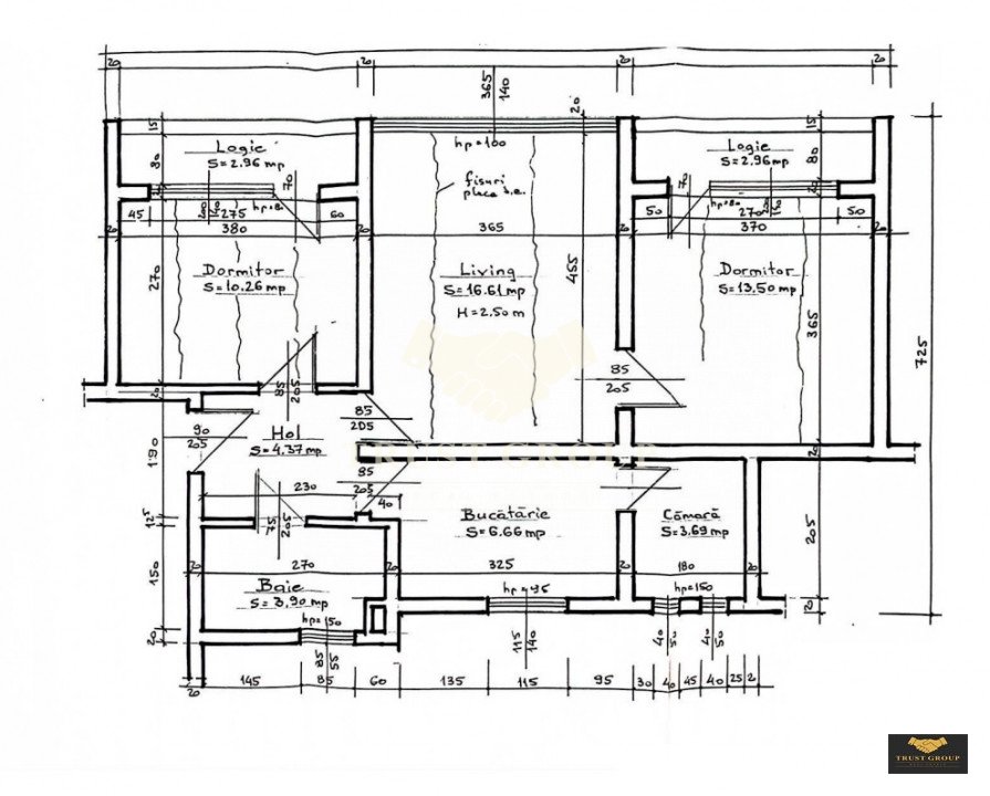 Dispune de o suprafata totala de 67mp, este semidecomandat si compartimentat astfel: living, bucatarie, doua dormitoare, o baie, hol, spatiii de depozitare si un balcon.