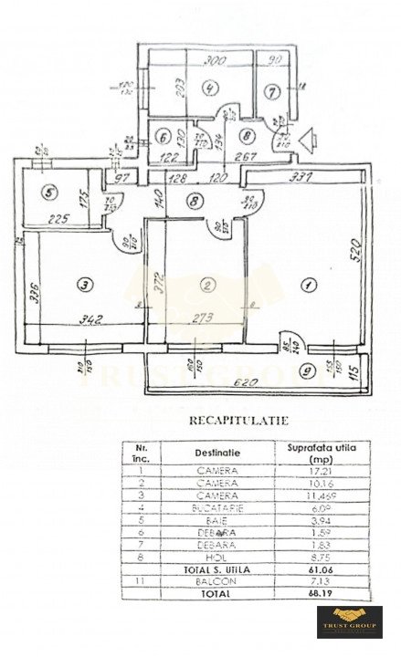 Dispune de o suprafata totala de 64mp, este decomandat si compartimentat astfel: living, bucatarie, doua dormitoare, baie, hol, spatii de depozitare si un balcon.