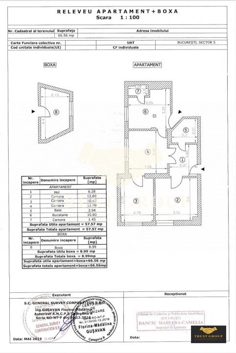 Dispune de o suprafata totala de 58mp, este semidecomandat si compartimentat astfel: living, bucatarie, doua dormitoare, o baie, hol si spatii de depozitare.