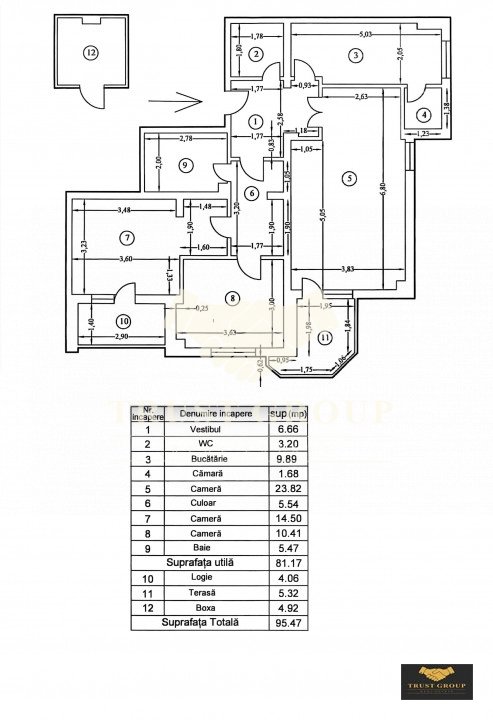 Dispune de o suprafata totala de 82mp, este decomandat si compartimentat astfel: living, bucatarie, doua dormitoare, doua bai, hol, spatii de depozitare si 2 balcoane.