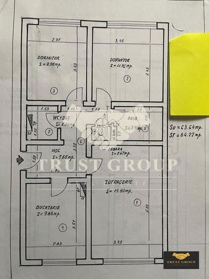 Dispune de o suprafata totala de 67mp, este decomandat si compartimentat astfel: living, bucatarie, doua dormitoare, doua bai, hol, spatii de depozitare si un balcon.