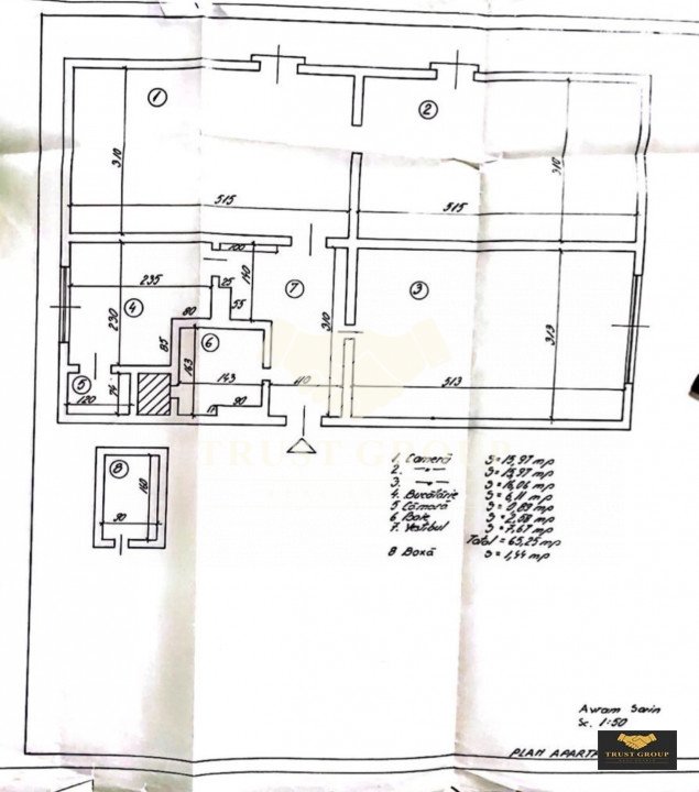 Dispune de o suprafata de 65,25mp, este semidecomandat si compartimentat astfel: living, bucatarie, 2 dormitoare, baie, hol si spatii de depozitare.