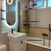 • Baia placată cu piatră naturală - travertin, cadă din fontă