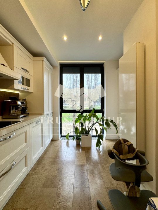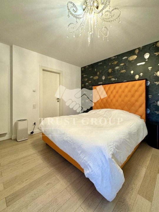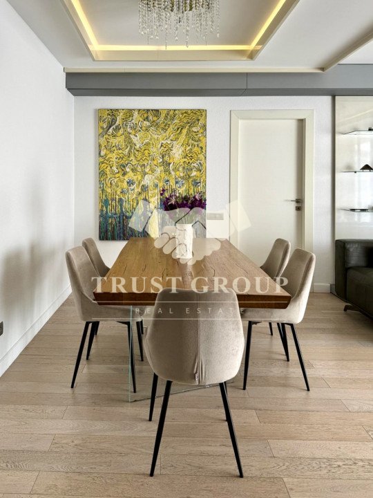 Apartamentul este amenajat cu mobilier modern, de top, iar jaluzelele electrice permit controlul luminii și al intimității cu un simplu gest. Finisajele sunt premium, ferestrele din aluminiu cu termopan asigură izolație superioară, iar climatizarea eficientă, împreună cu centrala proprie și încălzirea în pardoseală, garantează confort pe tot parcursul anului.