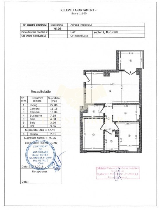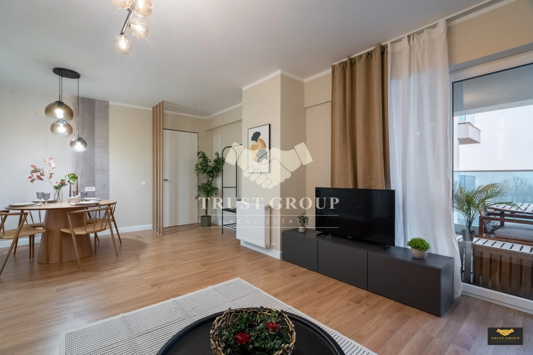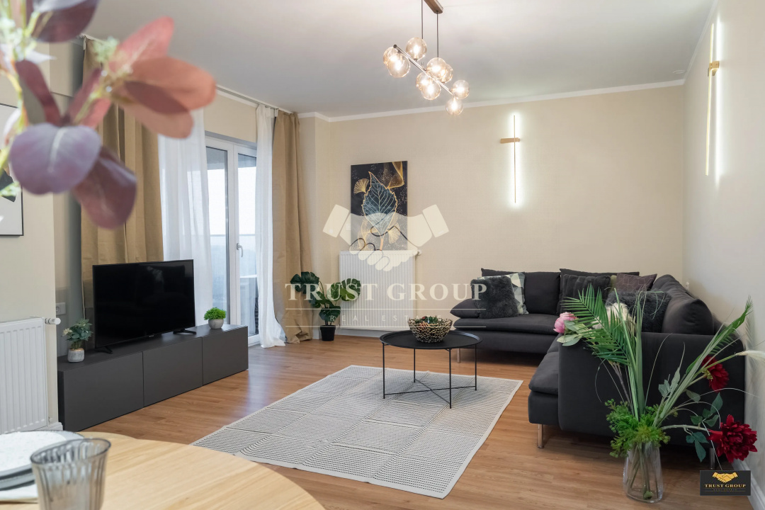 Dispune de o suprafata totala de 75mp, este decomandat si compartimentat astfel: living, bucatarie, doua dormitoare, doua bai, hol, spatii de depozitare si un balcon.