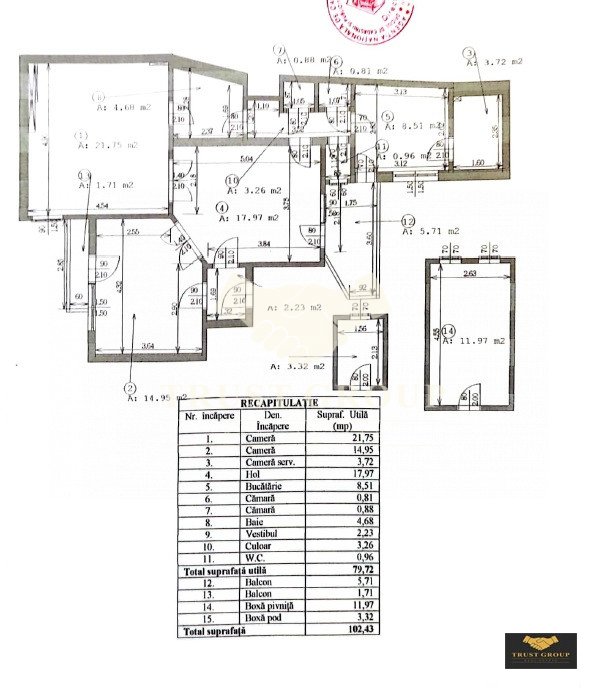 Apartamentul este situat la etajul 3 al unui imobil construit în 1940, cu structură din beton și regim de înălțime S+P+3+M. Suprafața utilă este de 80 mp, cu un balcon de 7,42 mp, suprafața totală fiind de 87,42 mp, iar suprafața construită de 120 mp. Apartamentul este semidecomandat și se vinde mobilat și utilat, inclusiv cu două boxe, una la subsol și una în pod, oferind spațiu generos de depozitare.