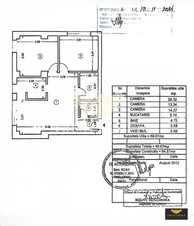 Dispune de o suprafata totala de 69mp, este semidecomandat si compartimentat astfel: living, bucatarie, doua dormitoare, doua bai, hol, spatii de depozitare.