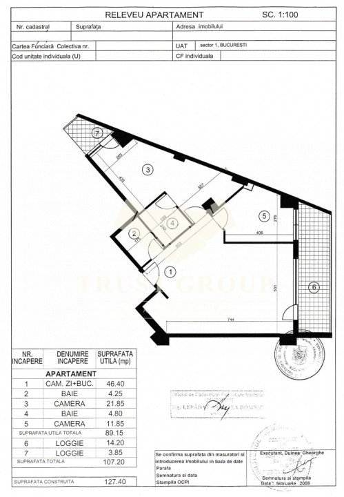 Dispune de o suprafata totala de 104mp, este semidecomandat si compartimentat astfel: living, bucatarie, doua dormitoare, doua bai, hol, spatiii de depozitare si doua balcoane.