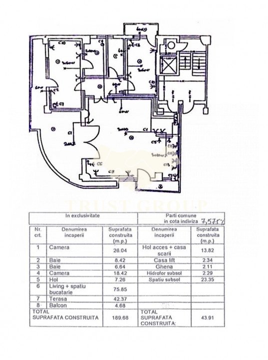 Situat la etajul 5 al unui imobil solid construit în 2006 din cărămidă, apartamentul are o suprafață utilă de 142 mp, completată de 3 balcoane însumând 4,68 mp și o terasă generoasă de 42 mp, rezultând un spațiu util total de 188,68 mp și o suprafață construită de 227 mp. Lumina naturală pătrunde din abundență în toate camerele, creând o atmosferă primitoare și elegantă.