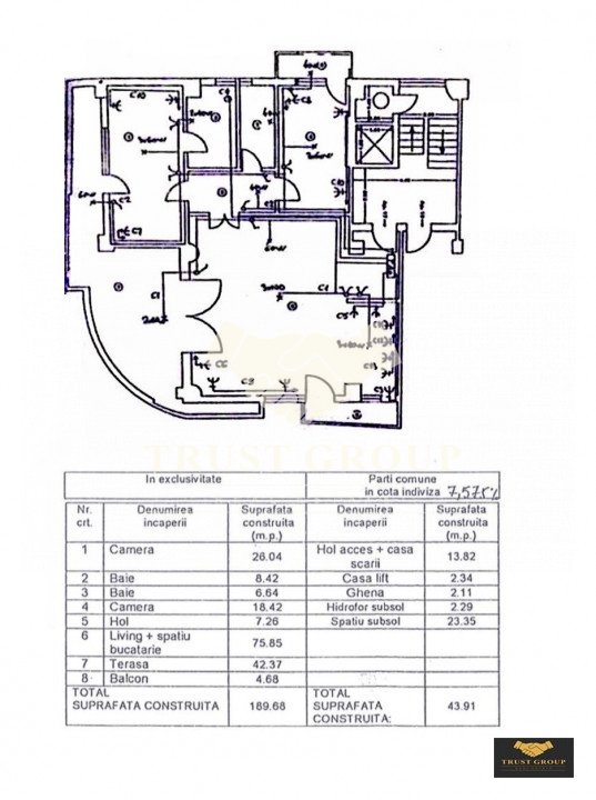Dispune de o suprafata de 189mp, este decomandat si compartimentat astfel: living cu bucatarie, 2 dormitoare, doua bai, hol, spatii de depozitare doua balcoane si o terasa