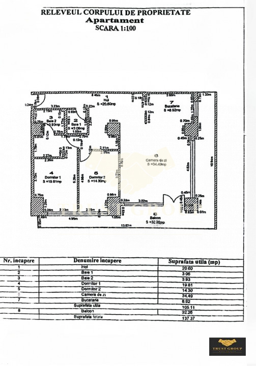 Compartimentarea este inteligent realizată, oferind intimitate și funcționalitate în egală măsură. Vei regăsi un living amplu, inundat de lumină naturală, perfect pentru serile petrecute în familie sau cu prietenii, două dormitoare spațioase și primitoare, o bucătărie care așteaptă să fie personalizată după gustul viitorului proprietar, precum și două băi moderne, ambele dotate cu cabine de duș elegante. În plus, apartamentul dispune și de un WC de serviciu – un detaliu practic și apreciat în locuințele de acest tip.