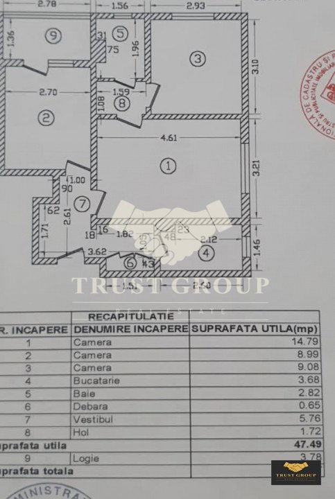 Dispune de o suprafata de 51.27 mp, este semidecomandat si compartimentat astfel: o bucatarie, 2 dormitoare, 1 living, o baie, hol, spatii de depozitare si un balcon.