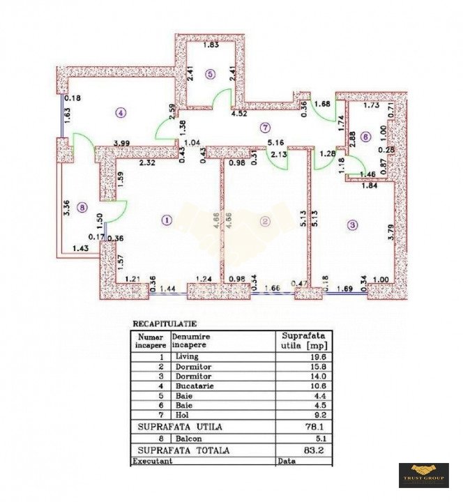 Dispune de o suprafata totala de 83mp, este decomandat si compartimentat astfel: living, bucatarie, dormitor, doua bai, hol, spatii de depozitare si un balcon.