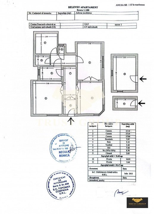 Dispune de o suprafata utila de 77mp, este semidecomandat si compartimentat astfel: living, bucatarie, doua dormitoare, doua bai, hol, spatii de depozitare.
