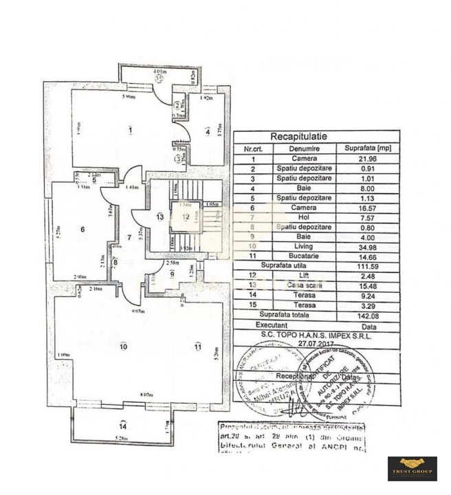 Dispune de o suprafata de 124mp, este decomandat si compartimentat astfel: living cu bucatarie, 2 dormitoare, doua bai, hol, spatii de depozitare si doua balcoane de 12mp.