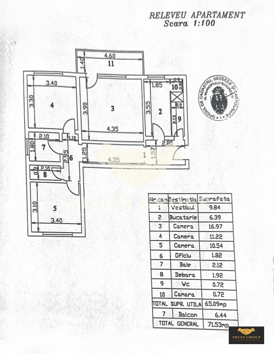 Apartamentul este situat la etajul 6 al unui bloc construit în 1978, cu regim de înălțime P+10, izolat termic pe exterior și securizat cu interfon. Suprafața utilă este de 65 mp, balconul are 6,5 mp, suprafața totală fiind de 72 mp, iar suprafața construită de 81 mp. Compartimentarea practică include: living, bucătărie, două dormitoare, două băi, hol și spații de depozitare, oferind confort și funcționalitate.