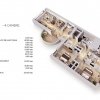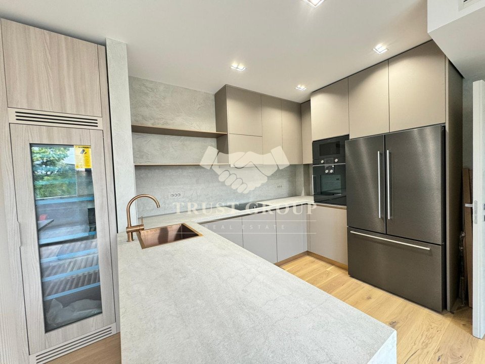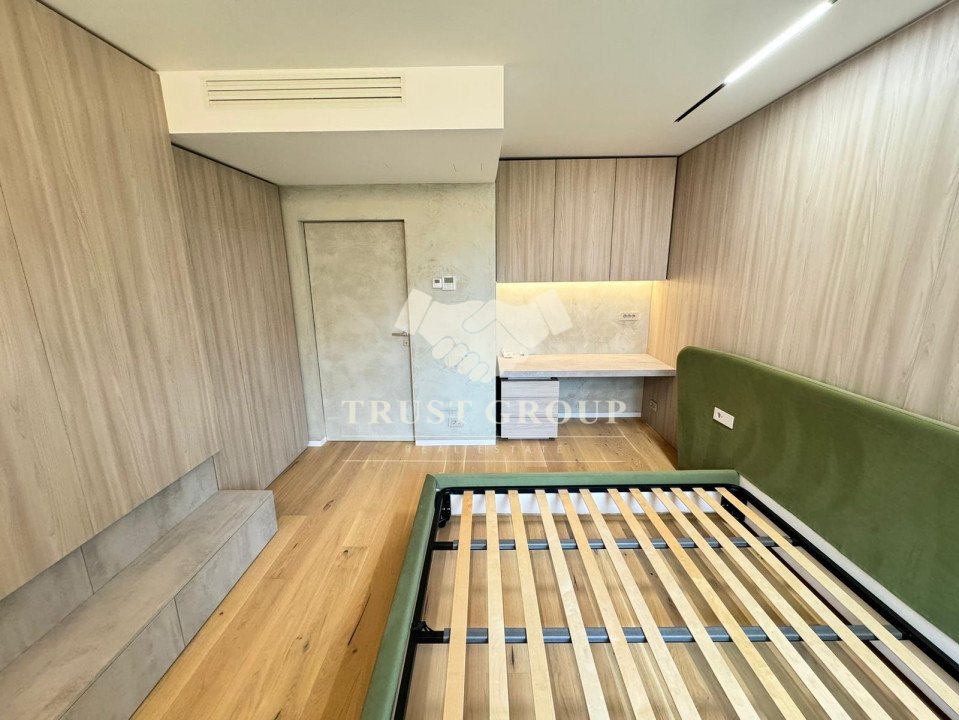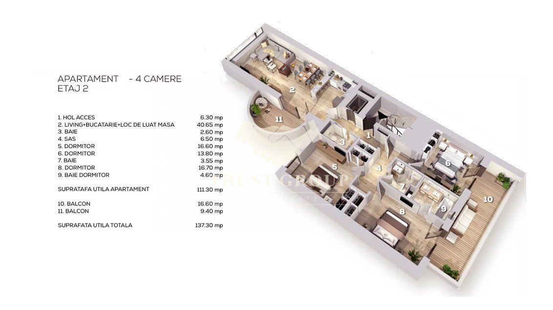 Dispune de o suprafata de 140mp, este decomandat si compartimentat astfel: living cu bucatarie si loc de luat masa, 3 dormitoare, trei bai, hol, spatii de depozitare si doua terase.