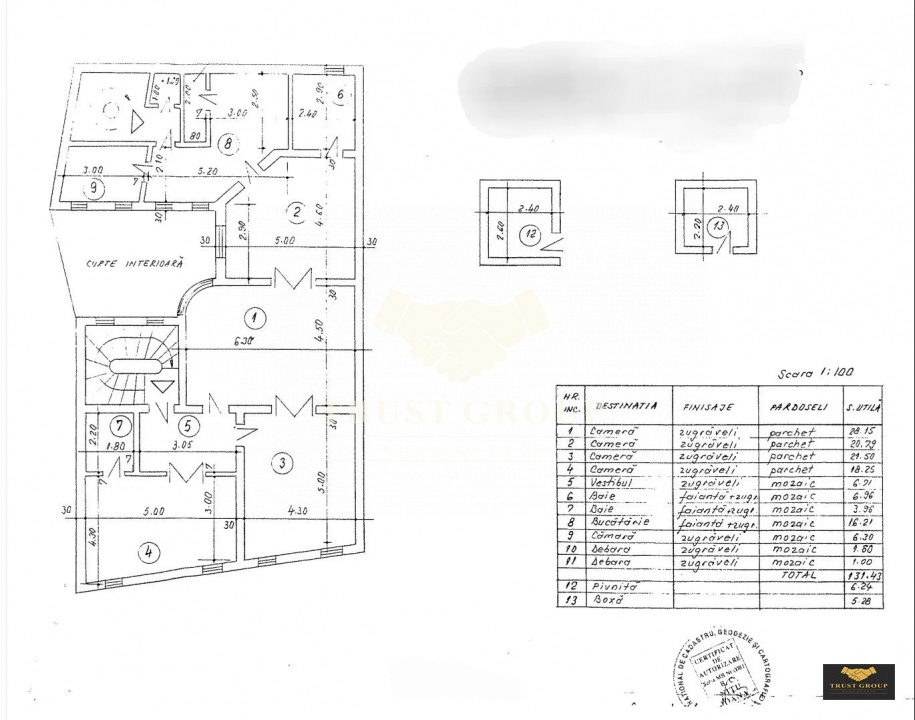 Dispune de o suprafata totala de 131mp, este circular si compartimentat astfel: living, bucatarie, trei dormitoare, doua bai, hol si spatii de depozitare.