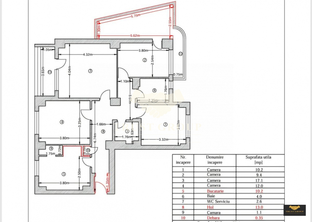 Dispune de o suprafata totala de 97mp, este decomandat si compartimentat astfel: living, bucatarie, trei dormitoare, doua bai, hol, spatii de depozitare si doua balcoane.
