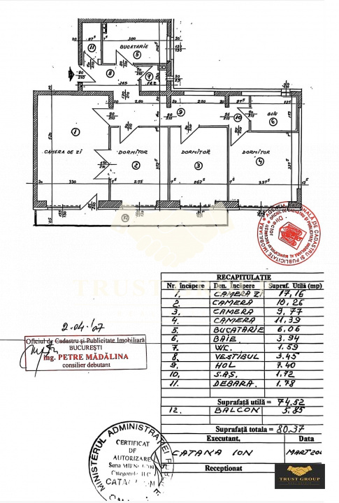 Dispune de o suprafata totala de 78mp, este decomandat si compartimentat astfel: living, bucatarie, trei dormitoare, doua bai, hol, spatii de depozitare si doua balcoane.