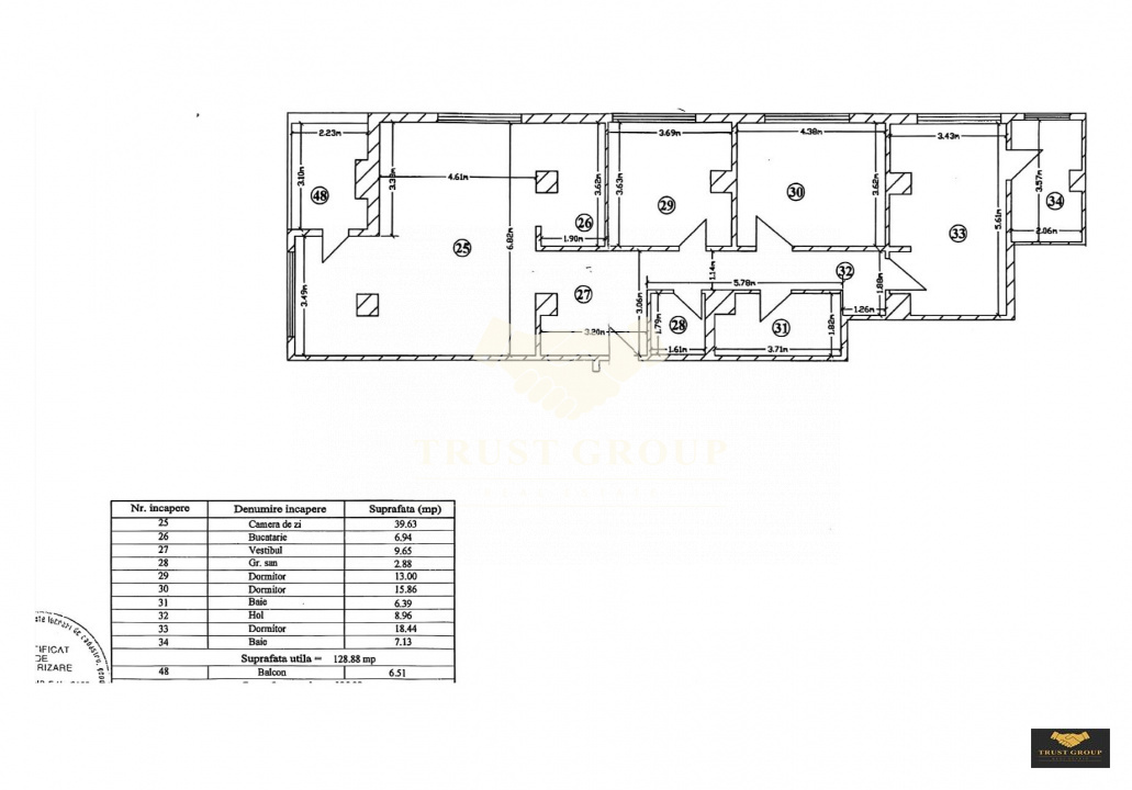 Dispune de o suprafata totala de 136mp, este decomandat si compartimentat astfel: living, bucatarie, trei dormitoare, doua bai, hol, spatii de depozitare si un balcon.