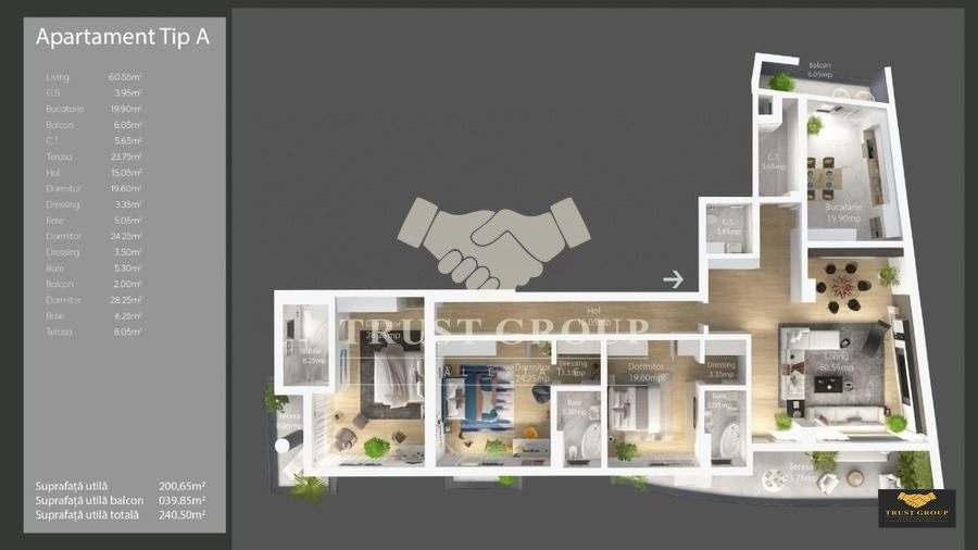 Dispune de o suprafata generoasa de 210mp, este decomandat si compartimentat astfel: living, bucatarie, 3 dormitoare, trei bai, hol , un balcon si o terasa.