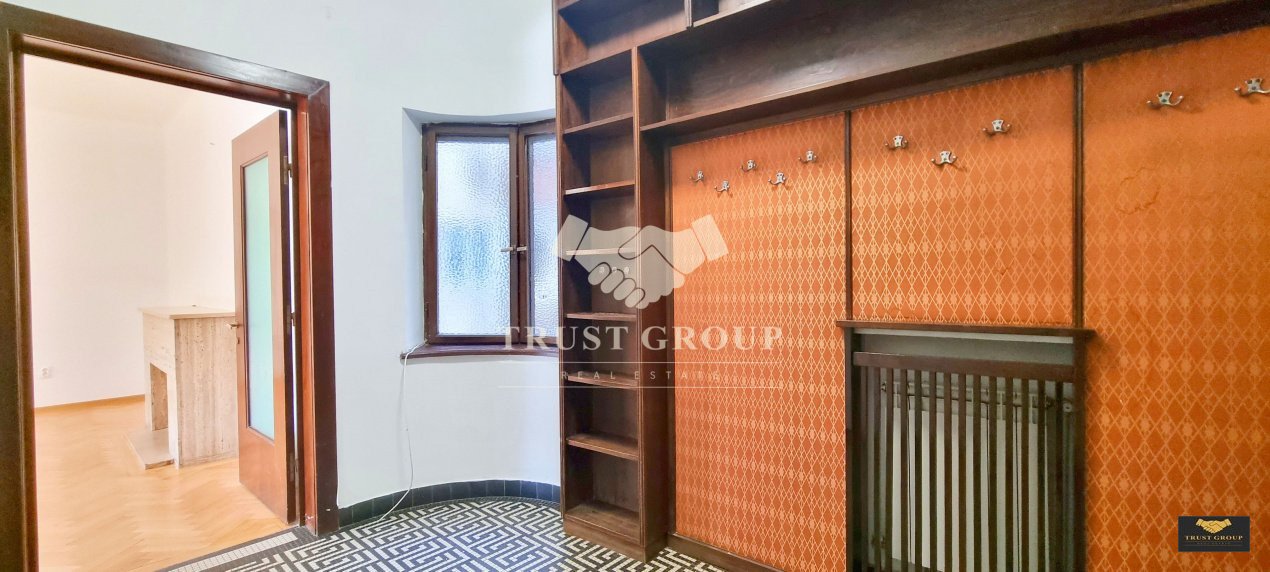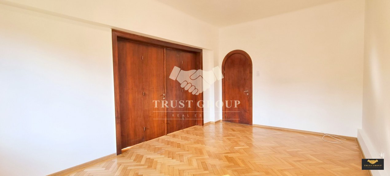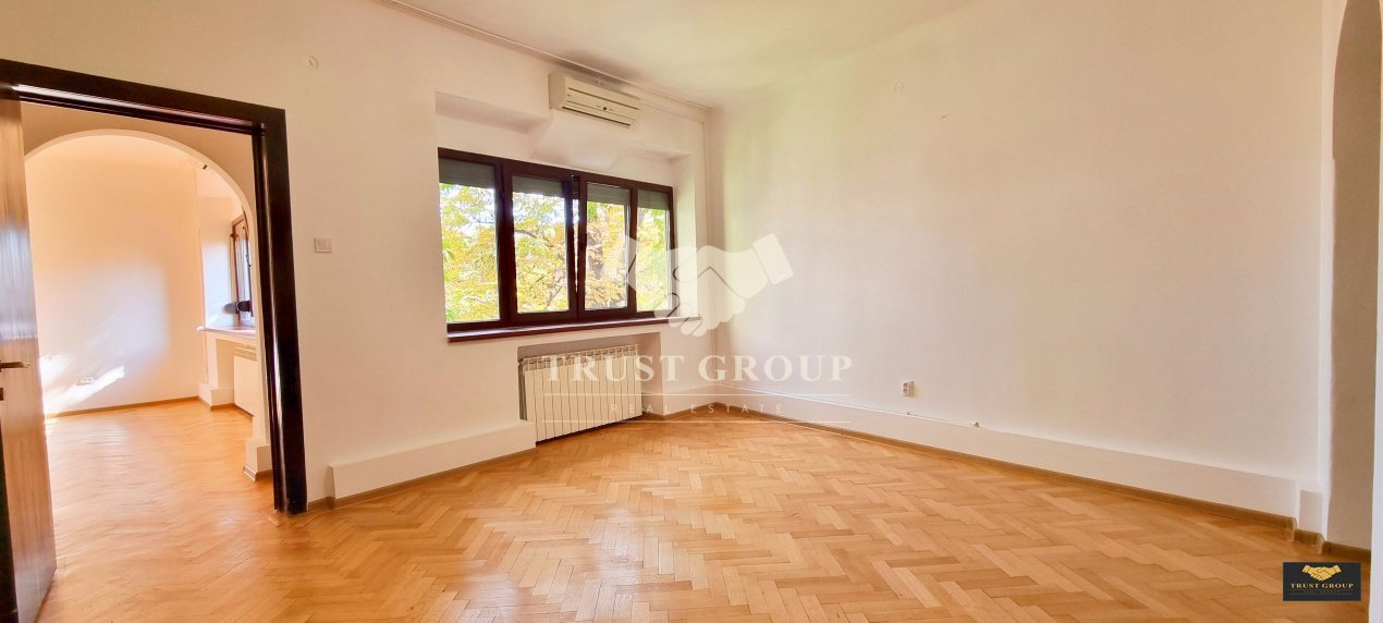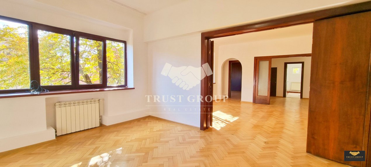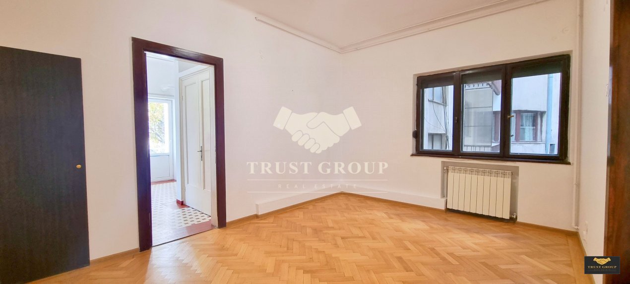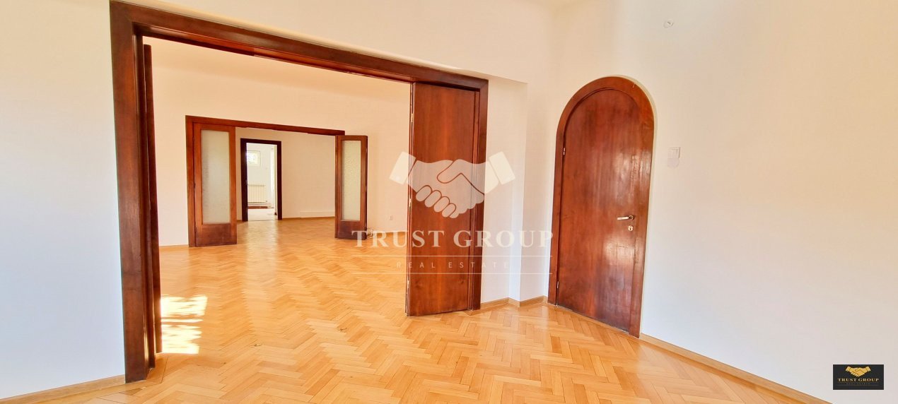 Apartamentul este incantator, impresionant si foarte luminos, fiind amplasat pe trei laturi ale blocului, pe colt orientat catre Sud, catre Est si catre Vest catre o curte interioara a blocului. Distribuirea incaperilor este facuta astfel, un vestibul primitor ce pastreaza elementele de pardoseala si spatiile de depozitare initiale, se continua cu un living foarte spatios de 33 mp ce are un semineu caracteristic perioadei cand a fost construit blocul, pe fiecare parte a livingului avem doua camere despartide de catre un glazvand, unul catre primul dormitor cu usi de lemn pline si a doua camera ce poate fi o prelungire a livingului sau un loc de luat masa, acestea fiind despartite de un glazvand cu usi de lemn si geamuri de sticla.