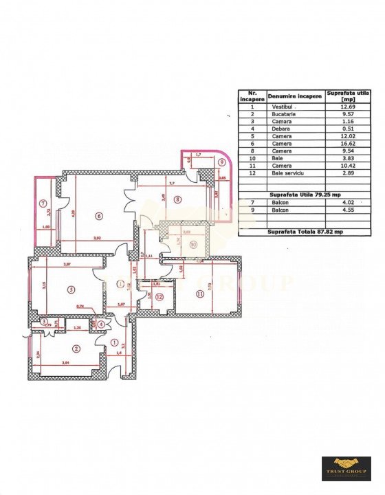 Dispune de o suprafata totala de 80mp, este semidecomandat si compartimentat astfel: living, bucatarie, trei dormitoare, doua bai, hol, spatii de depozitare si doua balcoane.