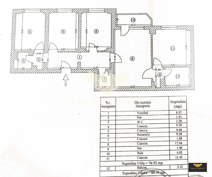 Dispune de o suprafata totala de 80mp, este semidecomandat si compartimentat astfel: living, bucatarie, trei dormitoare, doua bai, hol, spatii de depozitare si un balcon.