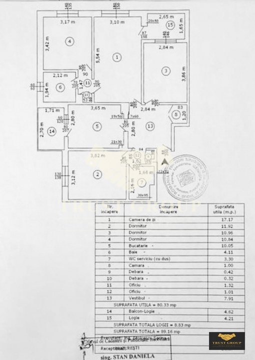 Dispune de o suprafata totala de 89mp, este semidecomandat si compartimentat astfel: living, bucatarie, trei dormitoare, doua bai, hol, spatii de depozitare si doua balcoane.