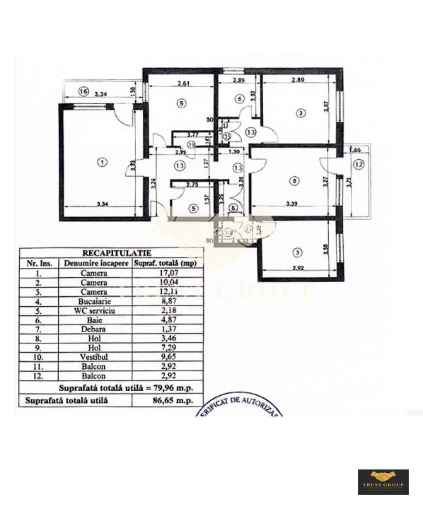 Dispune de o suprafata totala de 87mp, este decomandat si compartimentat astfel: living, bucatarie, trei dormitoare, doua bai, hol, spatii de depozitare si doua balcoane.