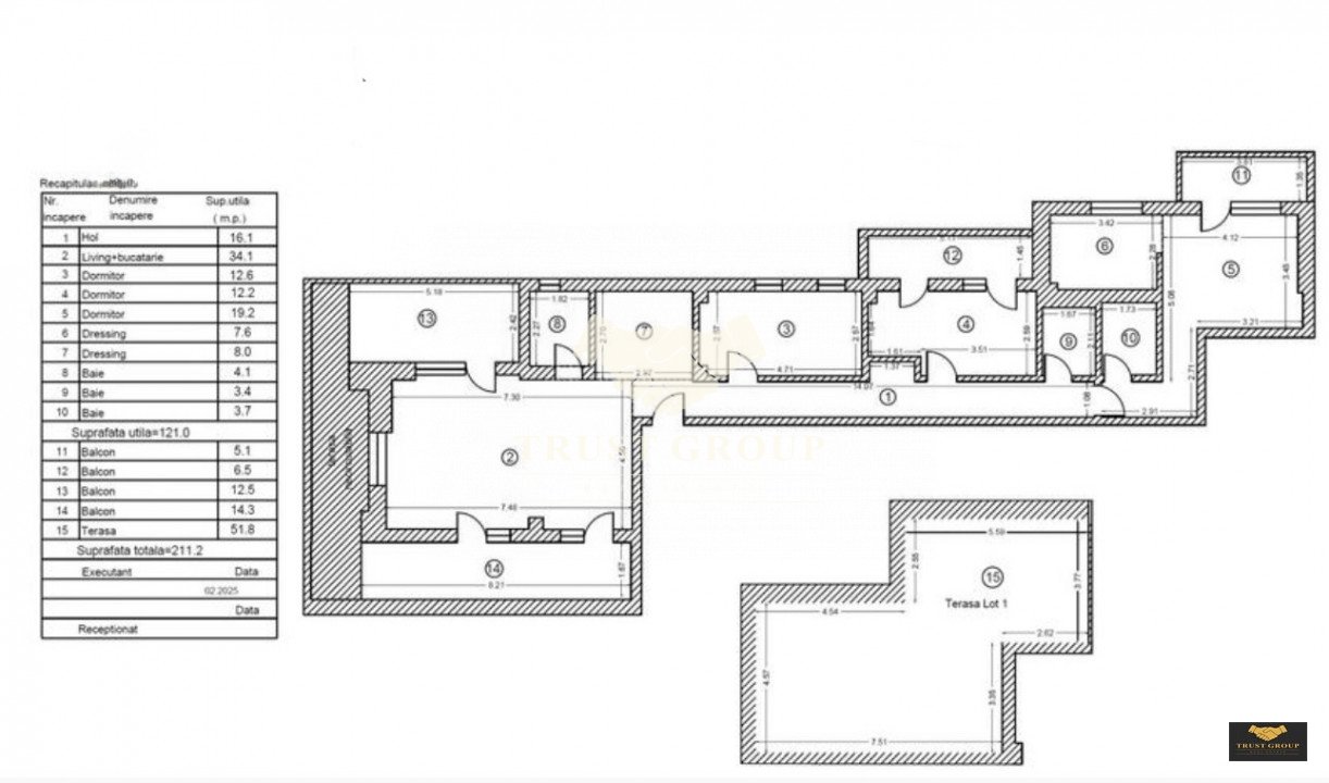 Apartamentul se afla la etajul 5, are o suprafata utila de 121mp iar acesta decomandat si compus astfel: un living cu zona de dining, bucatarie open-space, trei dormitoare, doua bai, un grup sanitar, spatii de depozitare, 4 balcoane de 38,4mp in total si o terasa de 51,8mp.
