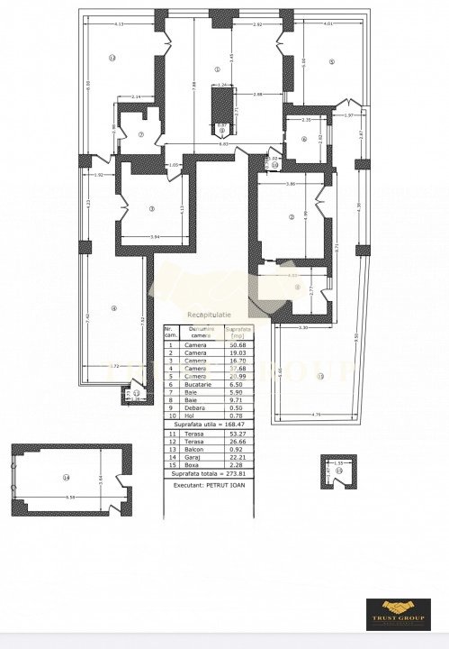 Compartimentarea este decomandată și include: living spațios, bucătărie, patru dormitoare luminoase, două băi, hol, spații de depozitare, plus două terase/zone exterioare — un adevărat penthouse clasic.