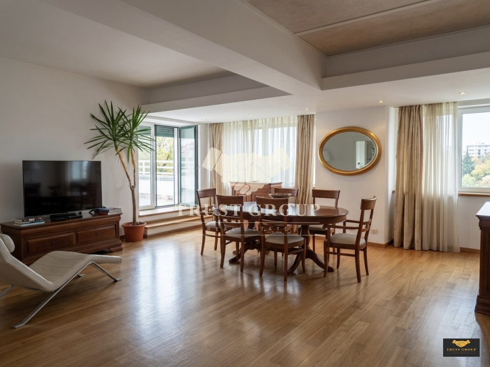 Compartimentarea este decomandată și include: living spațios, bucătărie, patru dormitoare luminoase, două băi, hol, spații de depozitare, plus două terase/zone exterioare — un adevărat penthouse clasic.