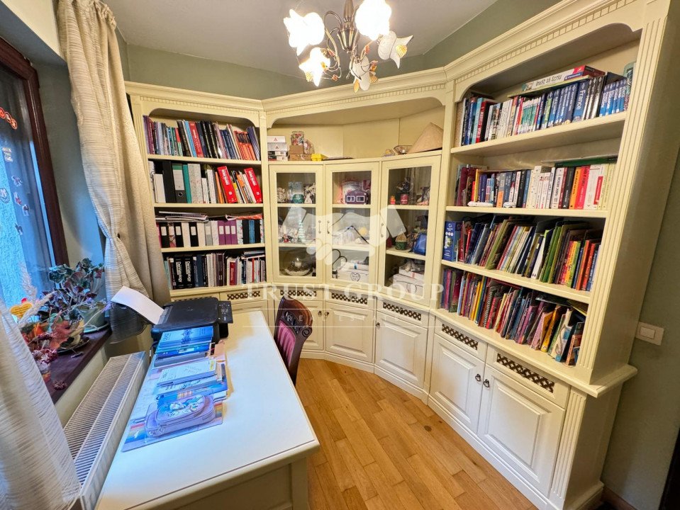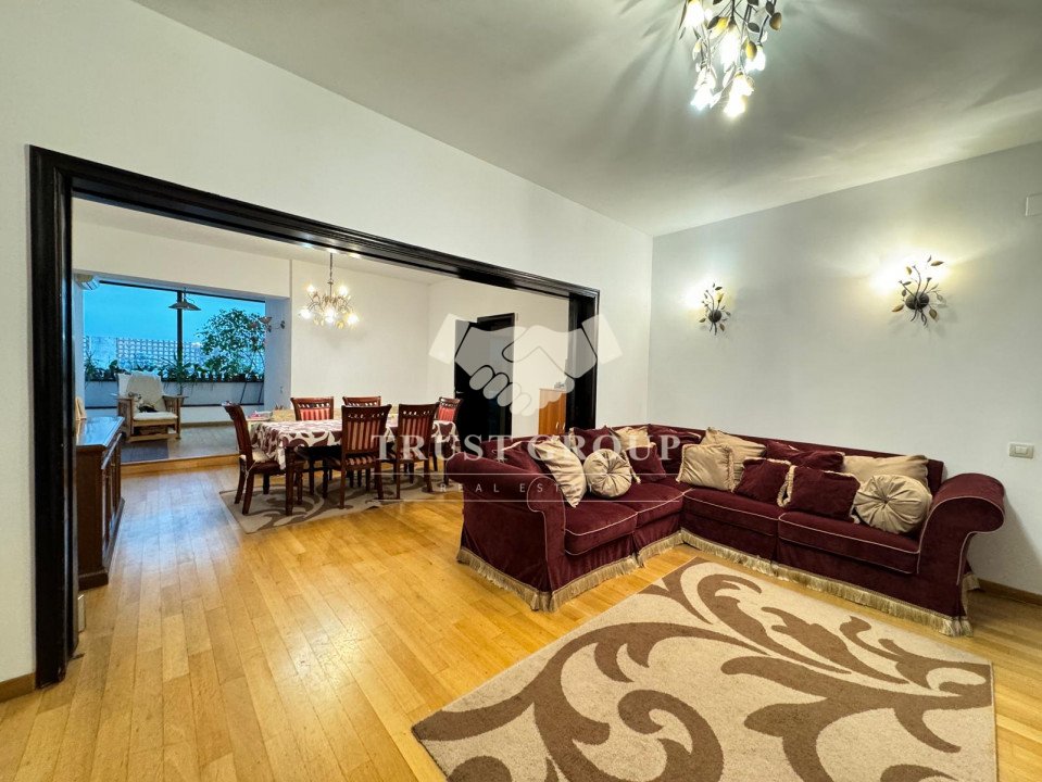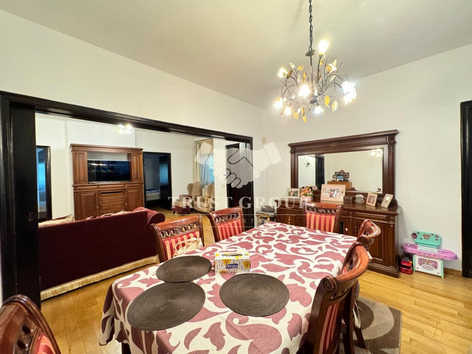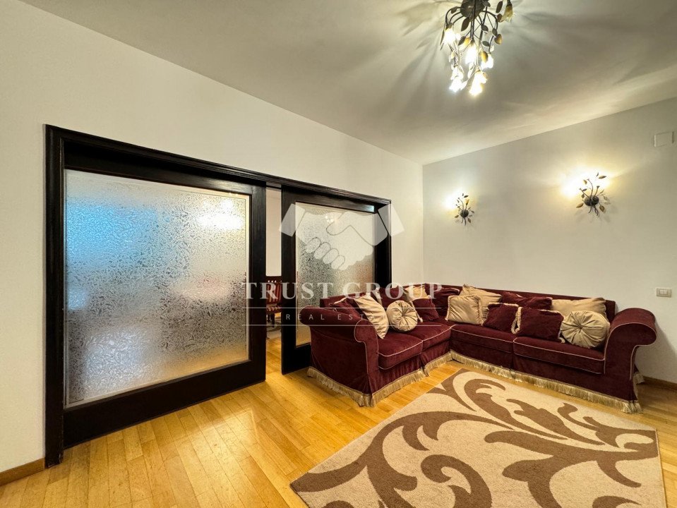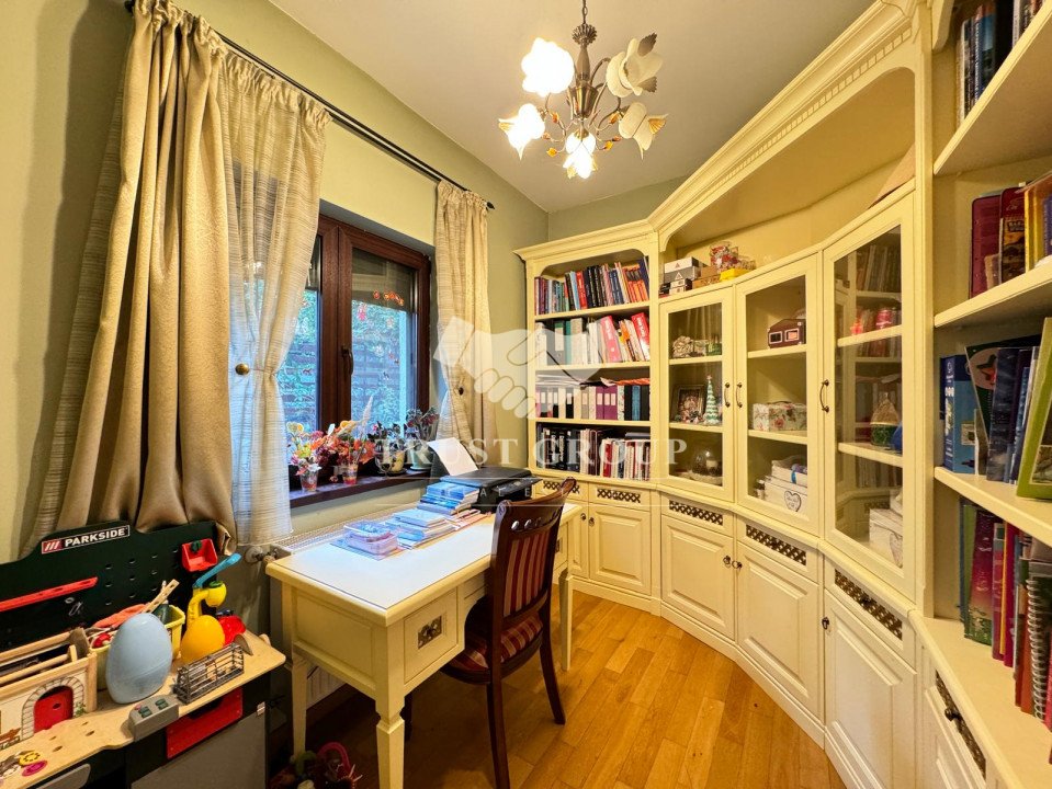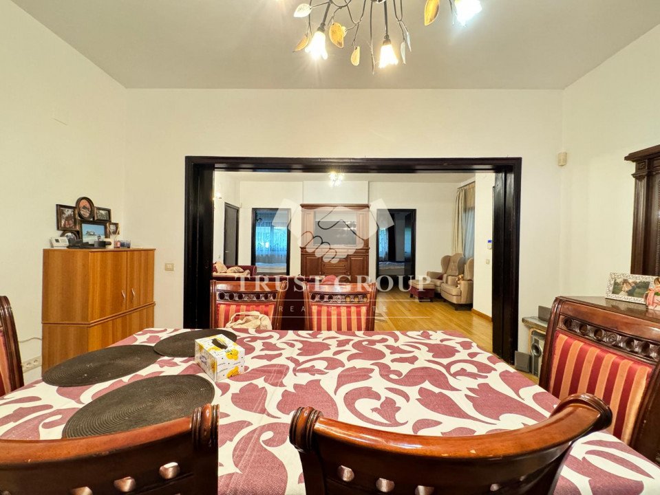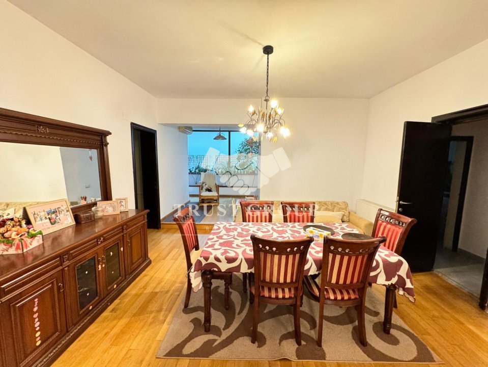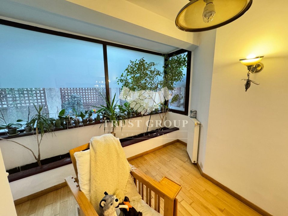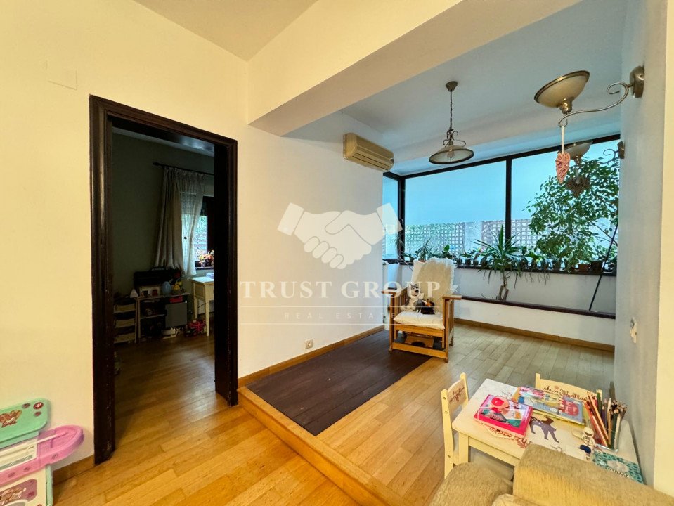 La parter - apartament cu 4 camere compus din zona de zi formata din doua camere generoase cu acces catre o logie inchisa, o baie pentru oaspeti, bucatarie inchisa mobilata si utilata, un dormitor matrimonial cu baie proprie si dressing, un dormitor secunda cu iesire pe balcon, o camera transformata in birou, spatii de depozitare si scara de acces catre demisol si curtea interioara avand o suprafata de 120mp.