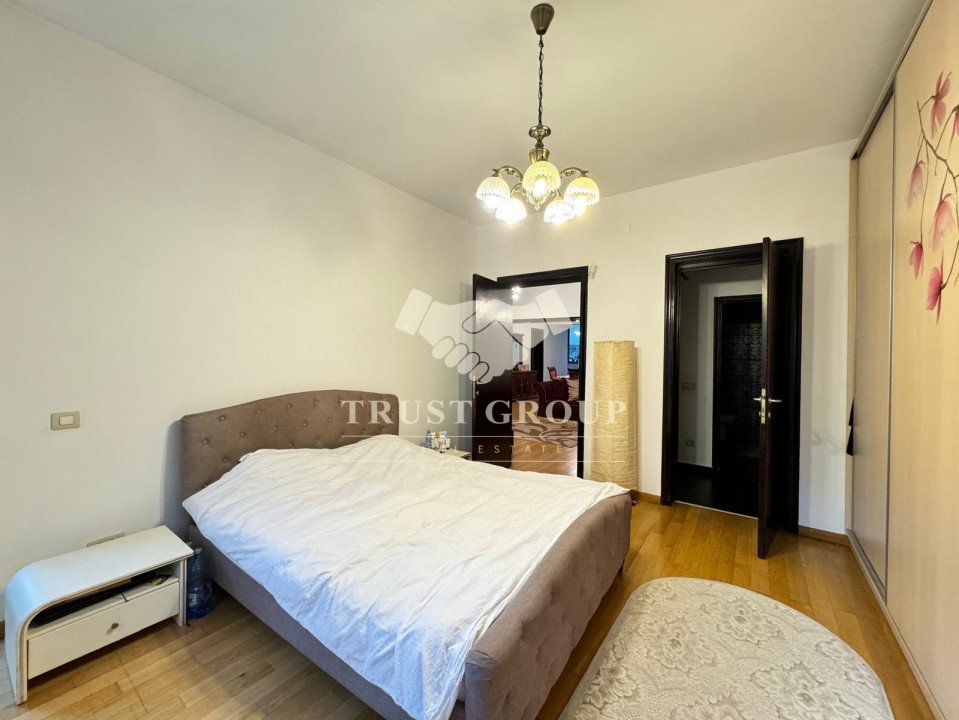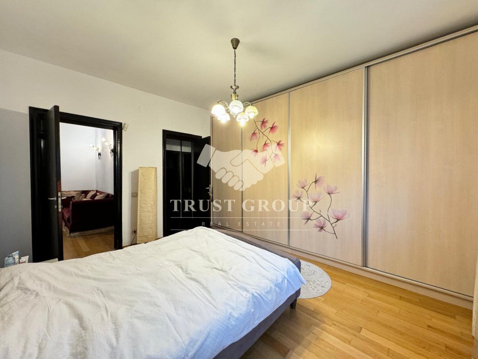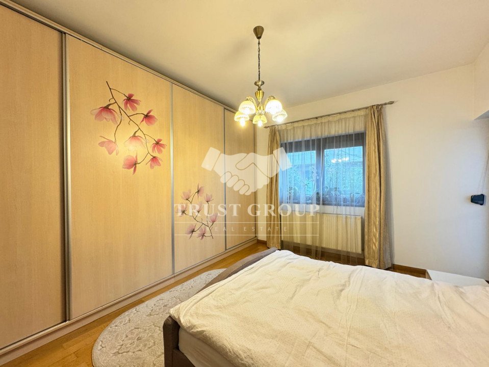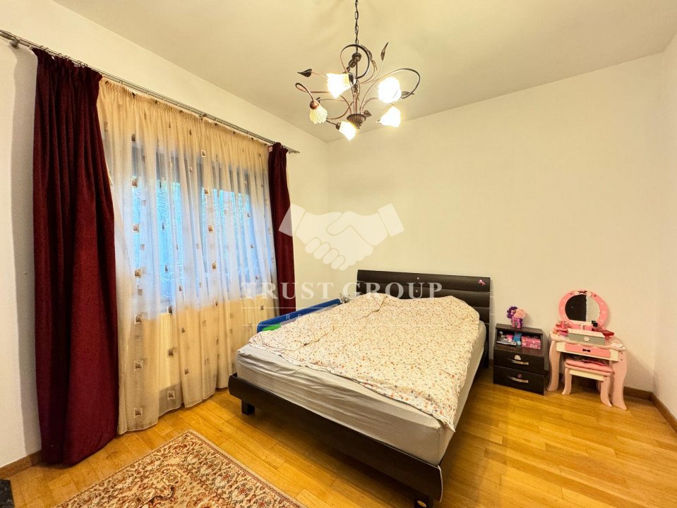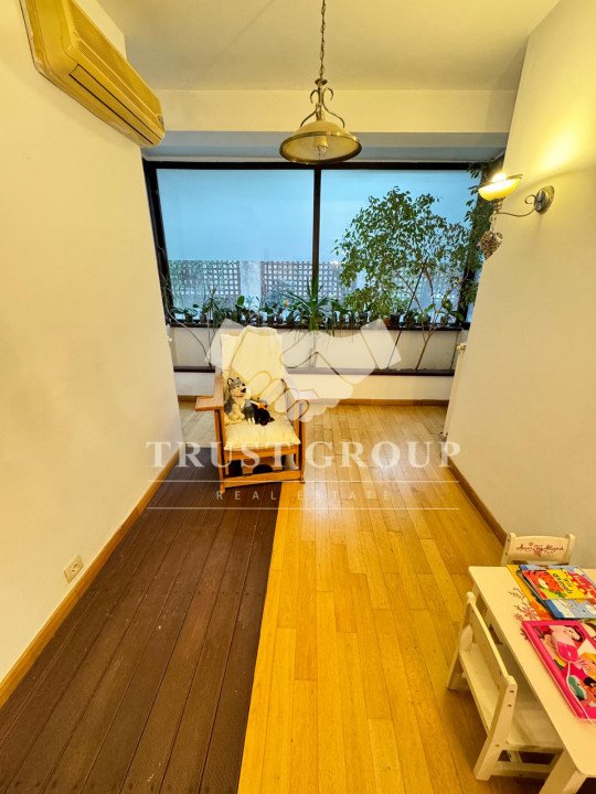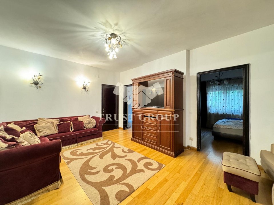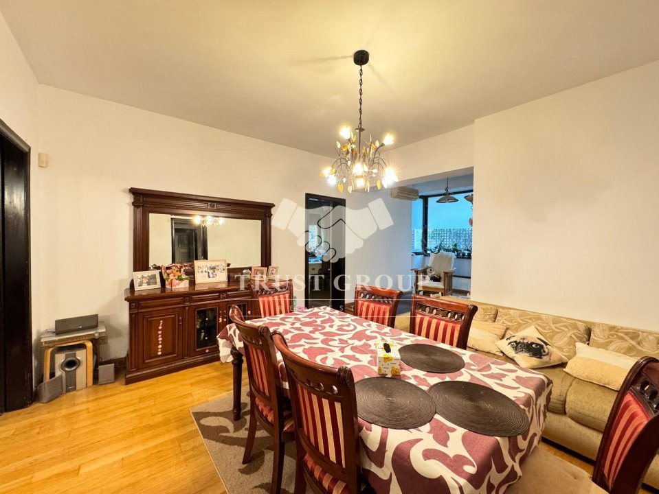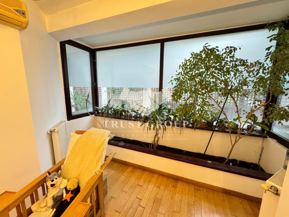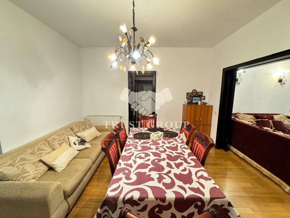 La parter - apartament cu 4 camere compus din zona de zi formata din doua camere generoase cu acces catre o logie inchisa, o baie pentru oaspeti, bucatarie inchisa mobilata si utilata, un dormitor matrimonial cu baie proprie si dressing, un dormitor secunda cu iesire pe balcon, o camera transformata in birou, spatii de depozitare si scara de acces catre demisol si curtea interioara avand o suprafata de 120mp.